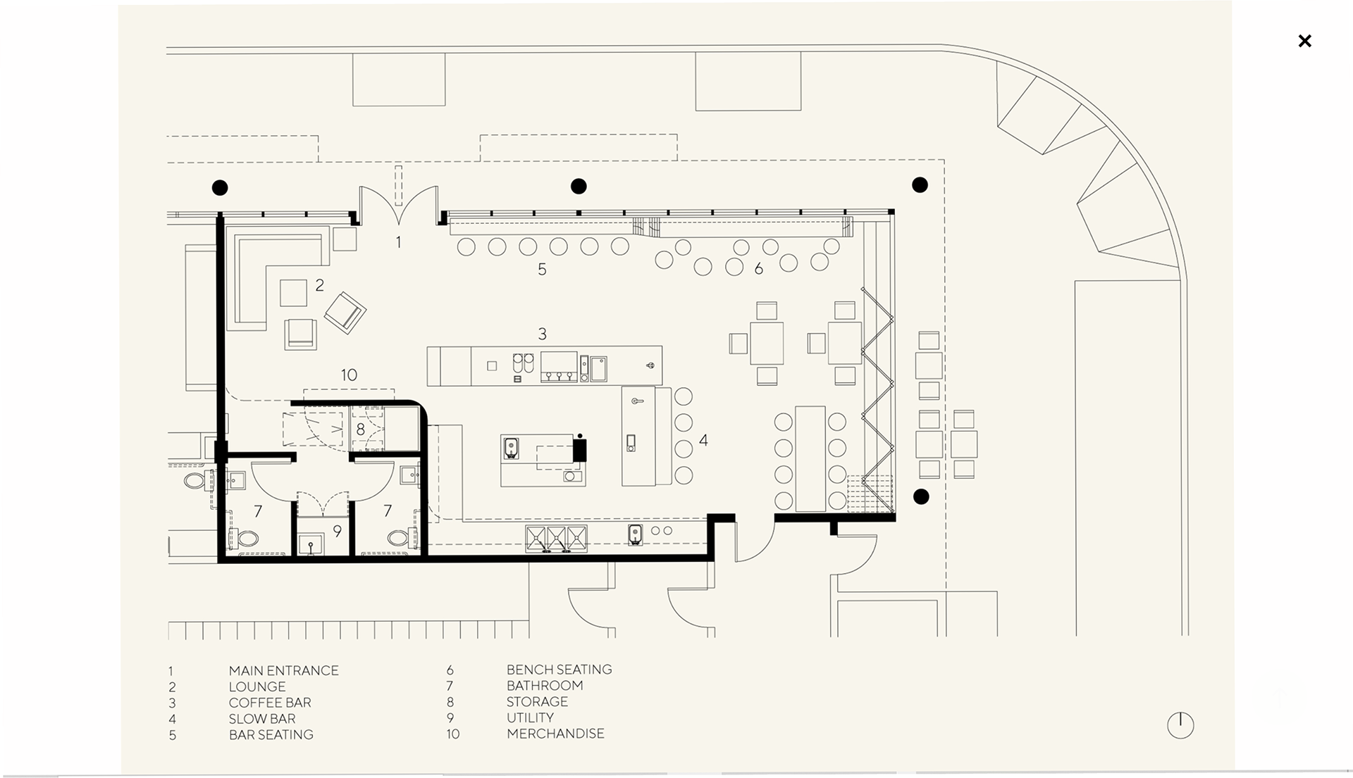The wall connects the passerby to the inside of the cafe. The host greets the patron, helps them locate the appropriate table, introduces the punch card (reinforcement system), quickly summarizes the space, and answers any questions.